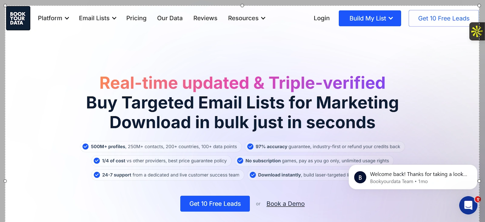 Best for: Bookyourdata is mainly suitable for teams that want flexible B2B email lists without any contracts or subscriptions.